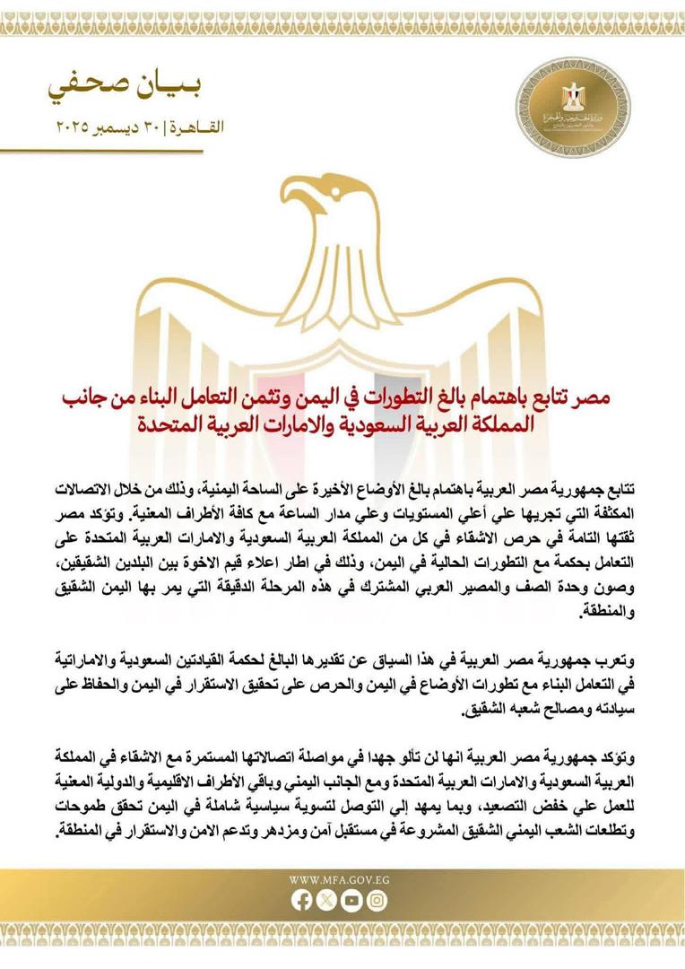 وتؤكد جمهورية مصر العربية انها لن تألو جهدا في مواصلة اتصالاتها المستمرة مع الاشقاء في المملكة العربية السعودية والامارات العربية المتحدة ومع الجانب اليمني وباقي الأطراف الاقليمية والدولية المعنية للعمل على خفض التصعيد، وبما يمهد إلى التوصل لتسوية سياسية شاملة في اليمن تحقق طموحات وتطلعات الشعب اليمني الشقيق المشروعة في مستقبل آمن ومزدهر وتدعم الامن والاستقرار في المنطقة.