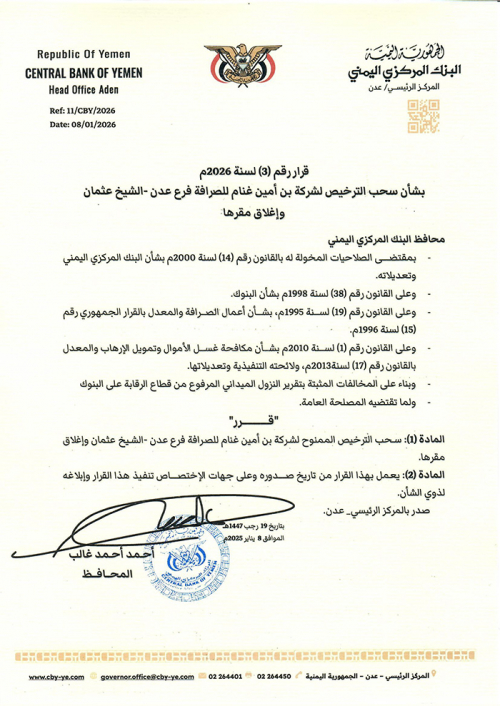 أصدر محافظ البنك المركزي أ. أحمد أحمد غالب قرار رقم (3) لعام 2026م، بشأن سحب ترخيص فرع شركة بن امين غنام للصرافة المخالفة، والمثبتة بتقرير النزول الميداني المرفوع من قطاع الرقابة على البنوك.