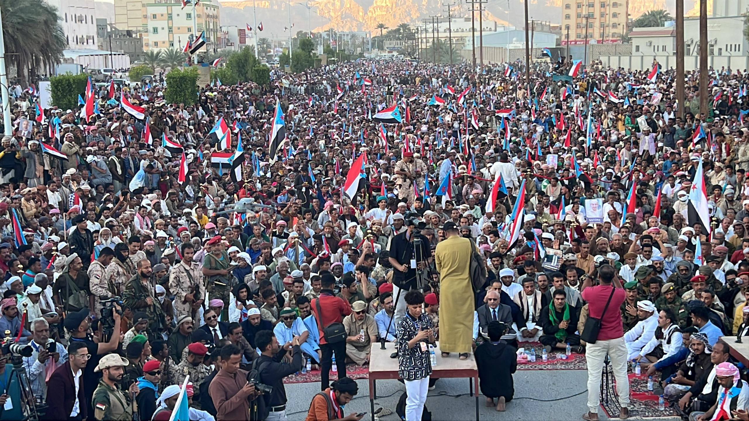 ثانياً: يؤكد المحتشدون أن ما تحقق من انتصارات هو استحقاق جنوبي طال انتظاره، وحق مشروع الشعب الجنوب في تأمين أرضه وحماية ثرواته، ولا يُعد بأي حال من الأحوال 2 على أي طرف في الداخل أو الخارج، بل خطوة ضرورية لترسيخ الأمن والاستقرار وخدمه السلم الإقليمي.