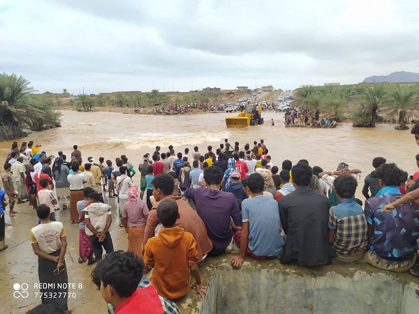 قطعت تدفقات مياه السيول بوادي حديبو، الطريق إلى المدينة التي تعد عاصمة محافظة سقطرى.