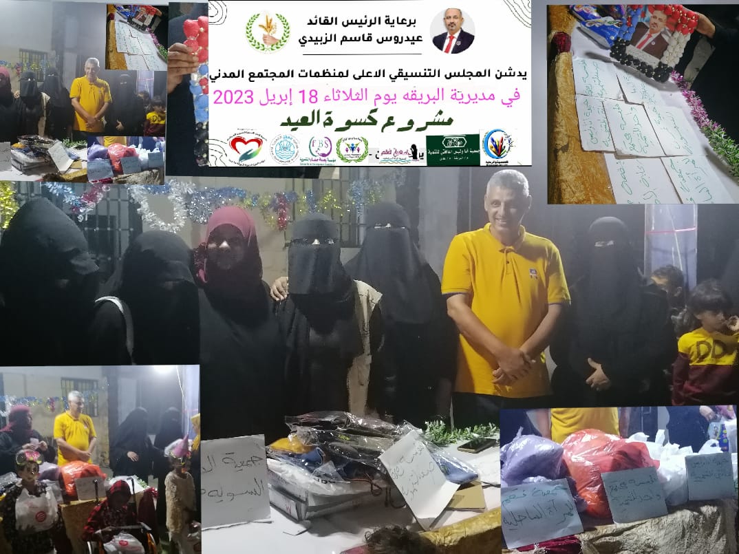 أقيم اليوم في مديرية البريقه محافظة عدن تدشين توزيع كسوه العيد برعايه كريمه من القائد اللواء عيدروس الزبيدي رئيس المجلس الانتقالي وعضو المجلس الرئاسي والداعم لكل فئات المجتمع في جنوبنا الحبيب حيت كان ختامها مسك اليوم في مديرية البريقه بداخل مبنى جمعية انا وليس اعاقتي للتنميه وبحضور كل الجمعيات والمؤسسات المنطوية تحت مظلة المجلس التنسيقي لمنظمات المجتمع المدنيى حيث كان بمشاركة جمعية فقم للمراه الساحليه ومؤسسة مجتمع واحد وجمعية الامل النسويه التنمويه ومؤسسة بصمة صفاء التنمويه ومنظمةحماية ورعاية الاطفال وجمعية عمران التنموبه وحضر التدشين الكابتن / محمد حسن رئيس نادي الشعله الذي حضر لدعم هذه الفئات لاجل توزيع كسوة العيد لرسم البسمه على وجوههم ....وقد رحبت القاضي / منى صالح بالحضور جميعهم واكدت بان توزيع كسوة العيد شملت كل المحافظات الجنوبيه بمختلف مديرياتها وهي عدن ولحج والضالع وابين وشبوه وحضرموت والمهره وسقطرى وهذه تعد لفته كريمه من القائد الزبيدي خاصه بخواتم الشهر الكريم وحلول عيد الفطر المبارك اعاده الله علينا وعلى امة محمد اجمعين بالصحه والامن والامان والاستقرار