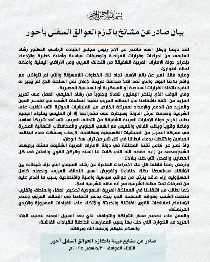 صادر عن مشايخ قبيلة باكازم العوالق السفلى بأحور،