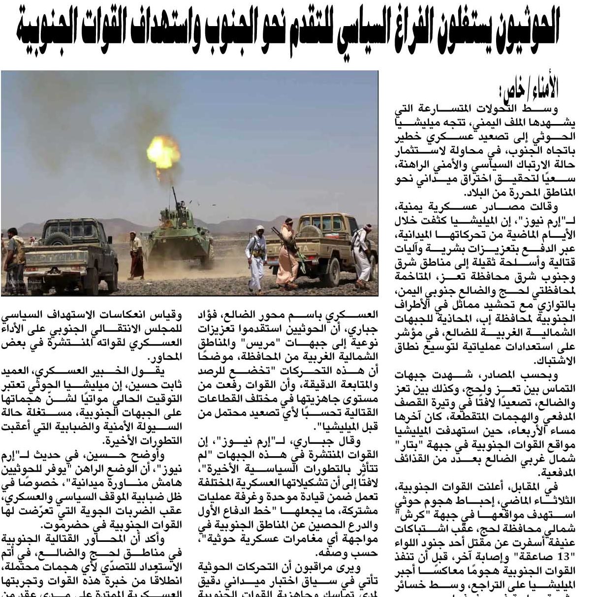 يقول الخبير العسكري، العميد ثابت حسين، إن ميليشيا الحوثي تعتبر التوقيت الحالي مواتيًا لشنّ هجماتها على الجبهات الجنوبية، مستغلة حالة السيولة الأمنية والضبابية التي أعقبت التطورات الأخيرة.