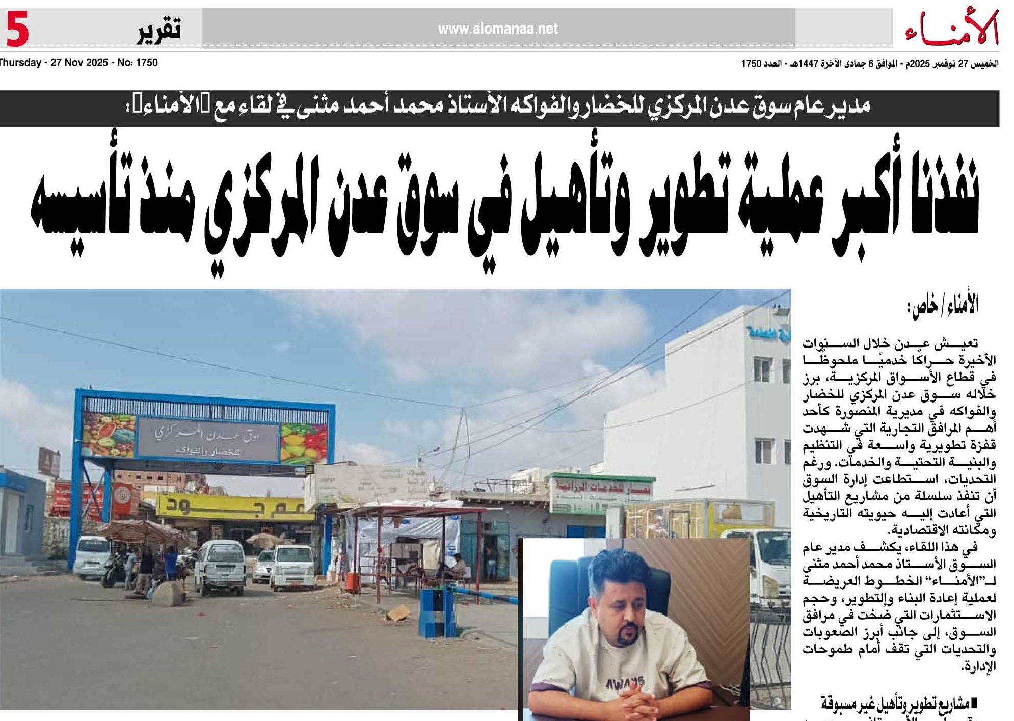 في هذا اللقاء، يكشف مدير عام السوق الأستاذ محمد أحمد مثنى لـ“الأمناء” الخطوط العريضة لعملية إعادة البناء والتطوير، وحجم الاستثمارات التي ضُخت في مرافق السوق، إلى جانب أبرز الصعوبات والتحديات التي تقف أمام طموحات الإدارة.