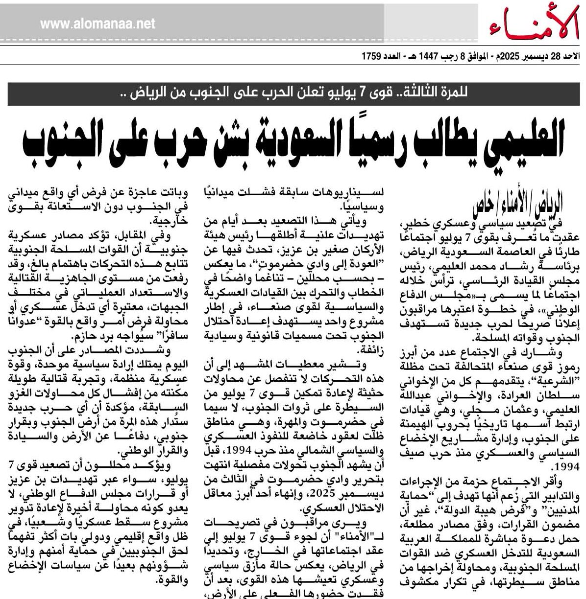 في تصعيد سياسي وعسكري خطير، عقدت ما تُعرف بقوى 7 يوليو اجتماعًا طارئًا في العاصمة السعودية الرياض، برئاسة رشاد محمد العليمي، رئيس مجلس القيادة الرئاسي، ترأس خلاله اجتماعًا لما يسمى بـ«مجلس الدفاع الوطني»، في خطوة اعتبرها مراقبون إعلانًا صريحًا لحرب جديدة تستهدف الجنوب وقواته المسلحة.