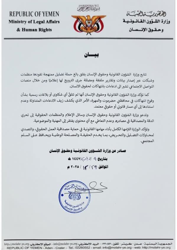 نفت وزارة الشؤون القانونية وحقوق الإنسان، بشكل قاطع، صحة ما يتم تداوله ونشره عبر بعض المنصات الإعلامية ووسائل التواصل الاجتماعي بشأن مزاعم وقوع انتهاكات لحقوق الإنسان في محافظتي حضرموت والمهرة، مؤكدة أن تلك التقارير ملفقة ومضللة وتندرج ضمن ادعاءات زائفة لا تستند إلى أي مسار قانوني أو حقوقي معتمد.