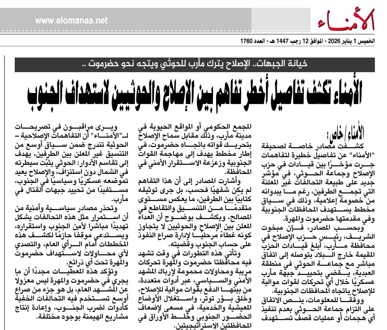 كشفت مصادر خاصة لصحيفة "الأمناء" عن تفاصيل خطيرة لتفاهمات جرت مؤخرًا بين قيادات في حزب الإصلاح وجماعة الحوثي، في مؤشر جديد على طبيعة التحالفات غير المعلنة التي تجمع الطرفين، رغم ما يبدوانه من خصومة إعلامية، وذلك في سياق مخطط يستهدف المحافظات الجنوبية وفي مقدمتها حضرموت والمهرة.